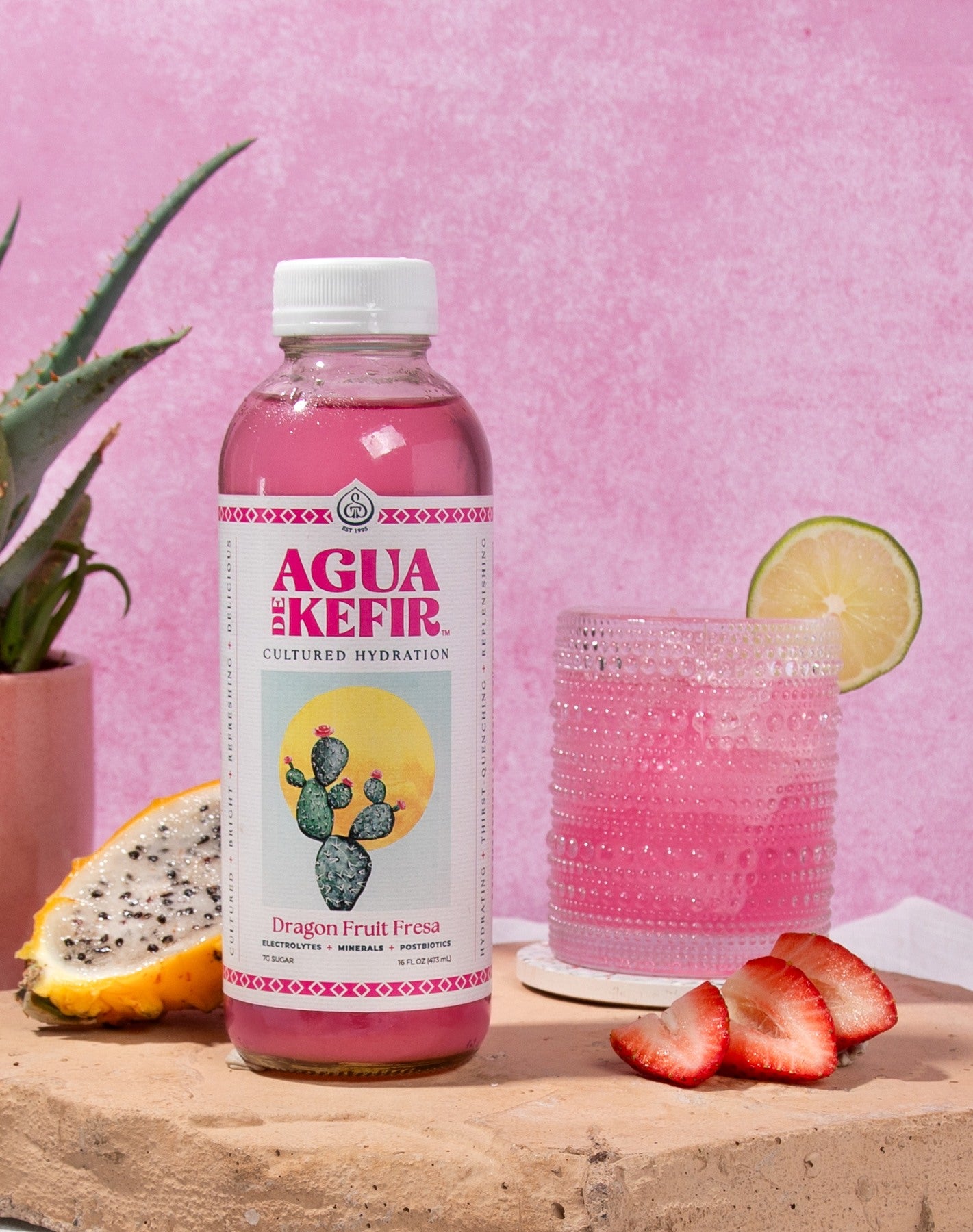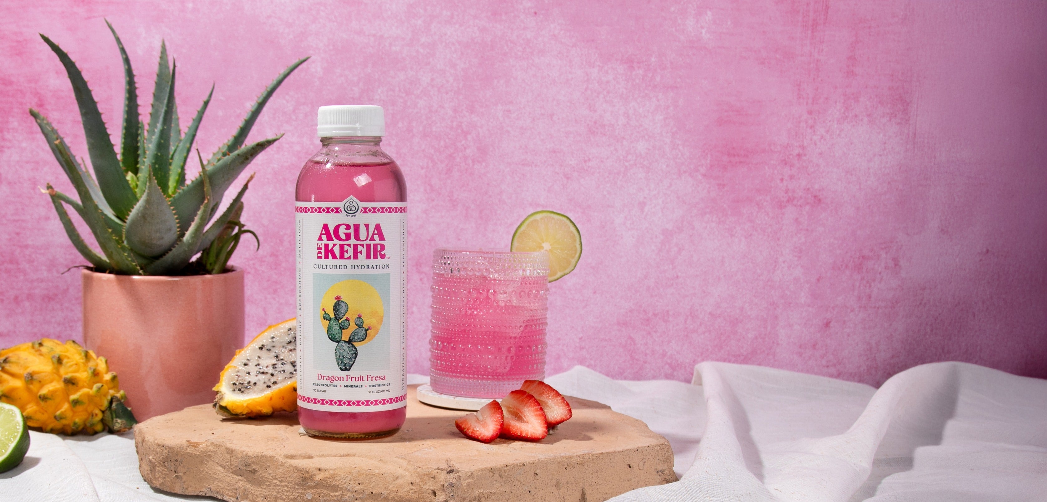 Ready to cool off? This bright, bold, and hydrating water kefir combines lightly sweet dragon fruit, a squeeze of lemon, and strawberry juice for a delightful refresher. Naturally fermented with water kefir crystals, each mouthwatering flavor of AGUA DE KEFIR provides nourishing broad-spectrum electrolytes, naturally occurring postbiotics, and only 7 grams of sugar. Exceptionally delicious and incredibly hydrating.